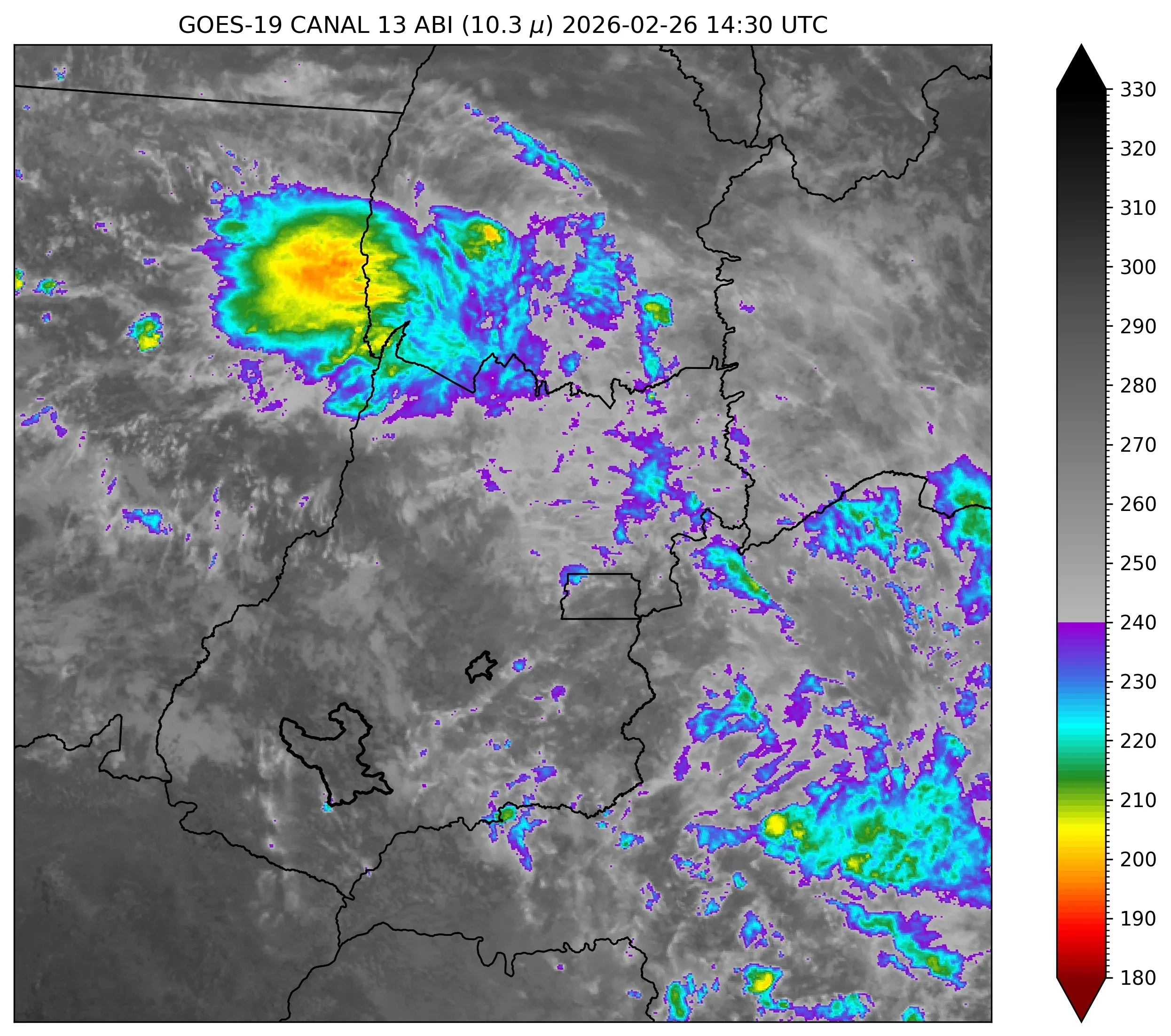 Figura 1. Painel esquerdo: produto derivado de precipitação diária acumulada (mm) do modelo meteorológico de previsão de tempo BRAMS, referente à data de 26/02/2026. Painel direito: produto derivado do satélite meteorológico GOES 19, canal infravermelho - as cores quentes indicam menor temperatura do topo das nuvens, portanto, maior altura do topo e maior probabilidade de ocorrência de tempestades ou chuvas intensas. Fonte: CEMPA-Cerrado. Painel inferior: produtos derivados do satélite meteorológico GOES 16, canal infravermelho e modelo COSMO - isóbaras representando a Pressão ao Nível Médio do Mar (hPa). Fonte: Instituto Nacional de Meteorologia - INMET.