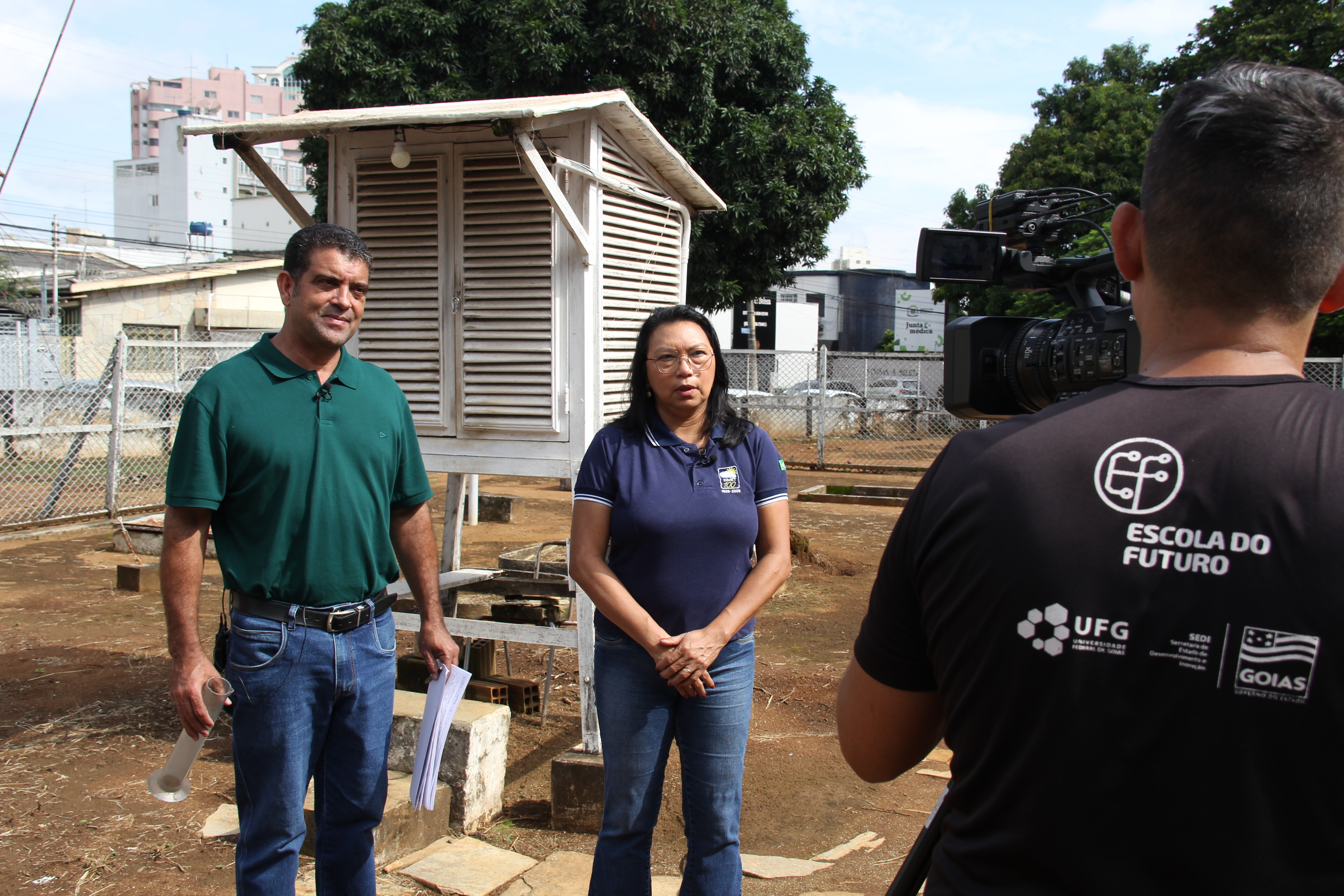 A coordenadora do INMET em Goiás e Tocantins, Elizabete Ferreira, e o observador Getúlio Ribeiro, durante a gravação da aula na estação meteorológica convencional do 10o Distrito Meteorológico, em Goiânia.
