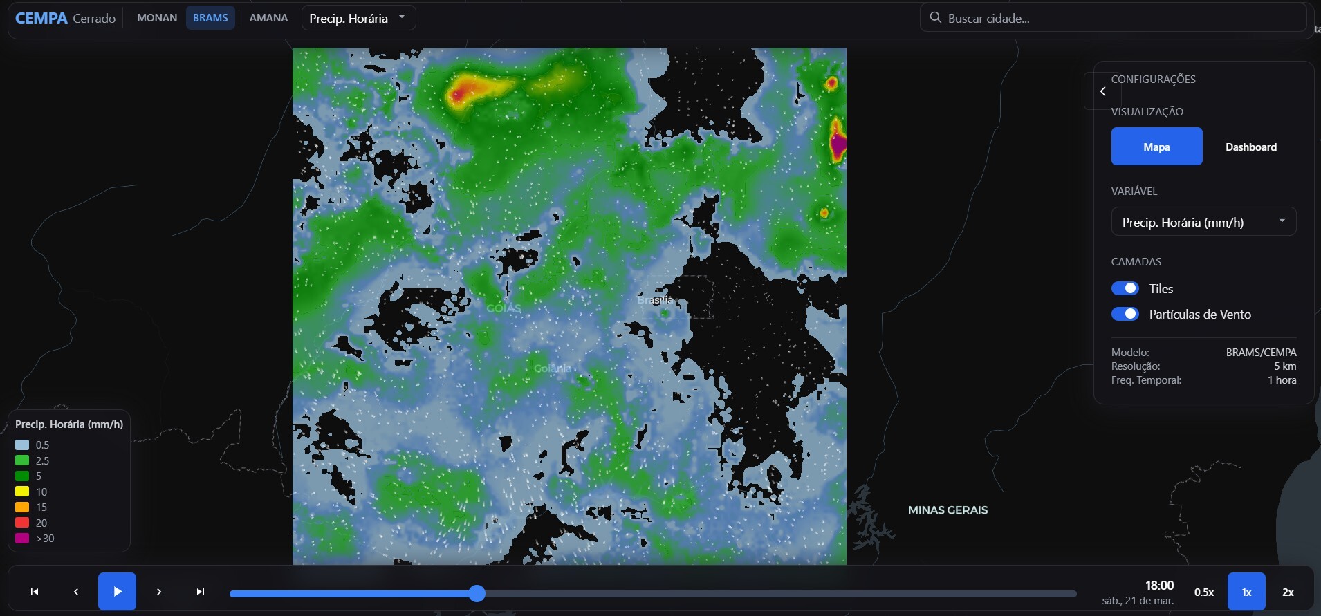Enquanto outras ferramentas oferecem acesso a modelos de escala global, a PPMIC foca nos modelos numéricos de área limitada operados pelo próprio CEMPA-Cerrado — o BRAMS (Brazilian Developments on the Regional Atmospheric Modeling System) e o MONAN (Model for Ocean-laNd-Atmosphere PredictioN) —, que rodam, para o território goiano, com resoluções espaciais que chegam a 2 km, no caso da Região Metropolitana de Goiânia e do sudoeste do estado. Isso permite uma das principais inovações da plataforma: a consulta objetiva de variáveis meteorológicas, precipitação, temperatura e umidade, diretamente por município, para todas as cidades contempladas nos domínios dos modelos.
