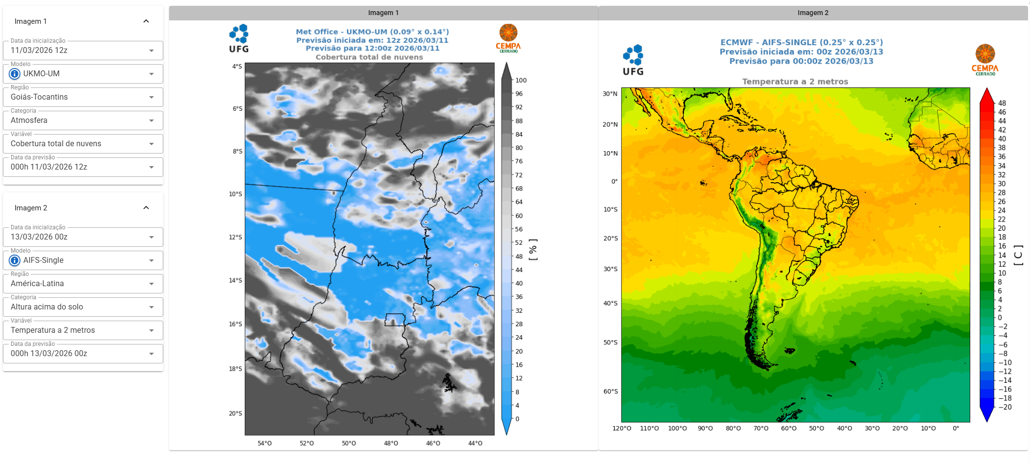A plataforma disponibiliza dois domínios geográficos principais para visualização das previsões: uma área continental ampliada que inclui a América do Sul, a América Central, o Caribe e o sul da América do Norte; e um domínio regional focado nos estados de Goiás e Tocantins, permitindo análises mais direcionadas para a região de atuação do CEMPA-Cerrado.